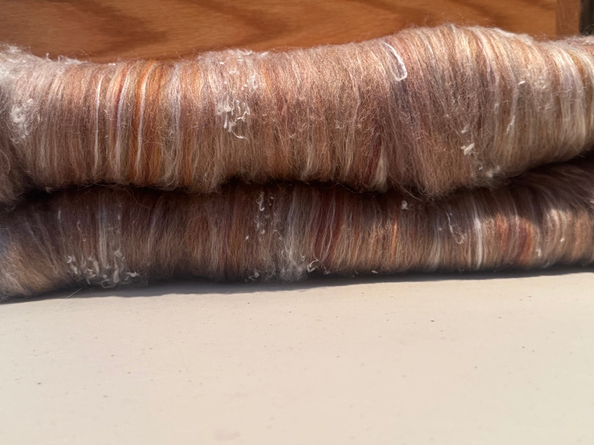 Please note: All of my batts have several pictures taken so you can view the various colors of fiber that are blended throughout the batt; most silks have been added to the batt in the center and on the top layer.