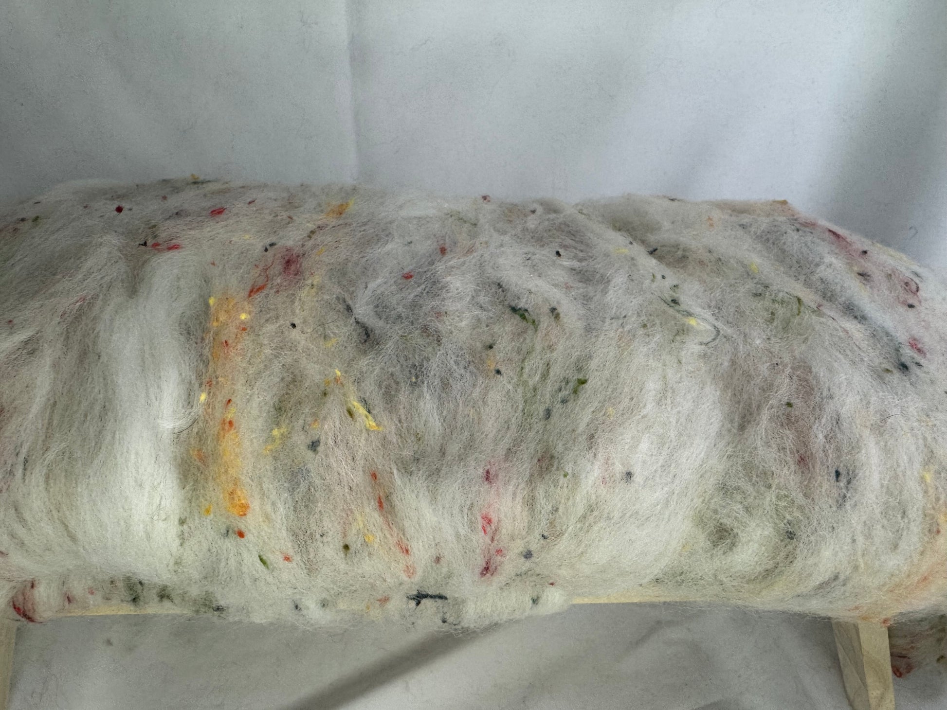 Mixed wool blend; All of my fabulous art batts are made with various fibers that I sell in my shop and may contain a variety of fiber types for texture such as tussah and mulberry silks, silk noils, locks, tencel, nylon, some items may be super wash, nepps(rarely), bamboos, sari silks etc.