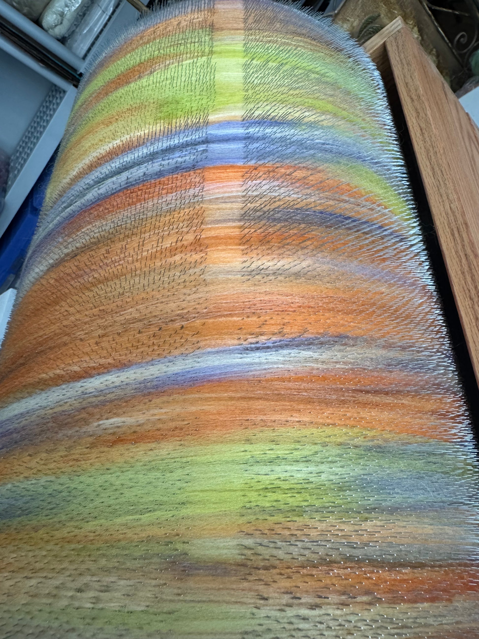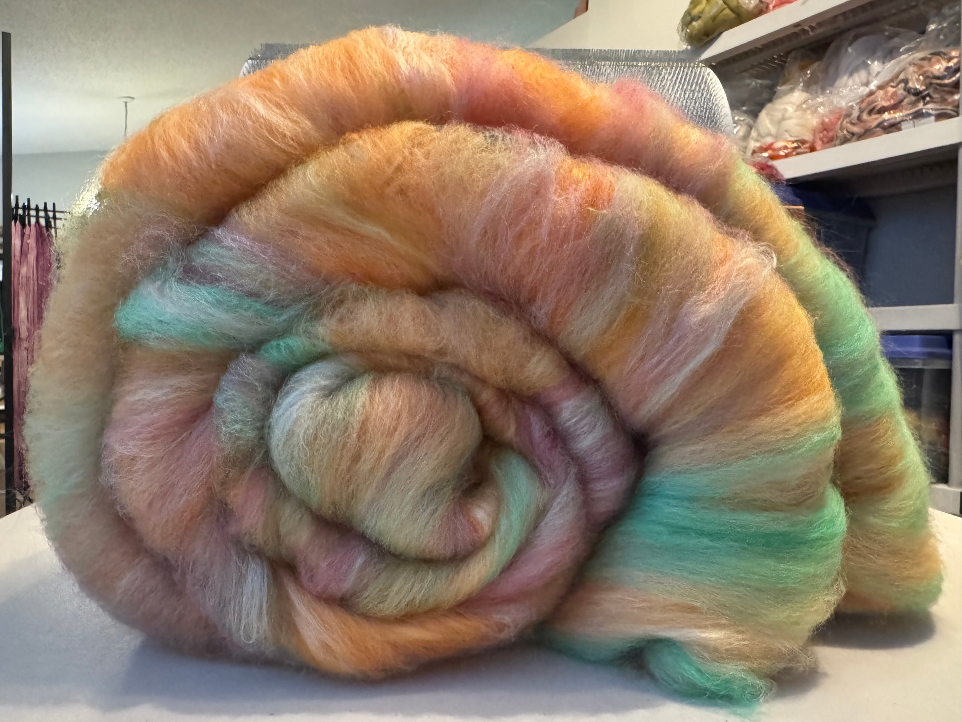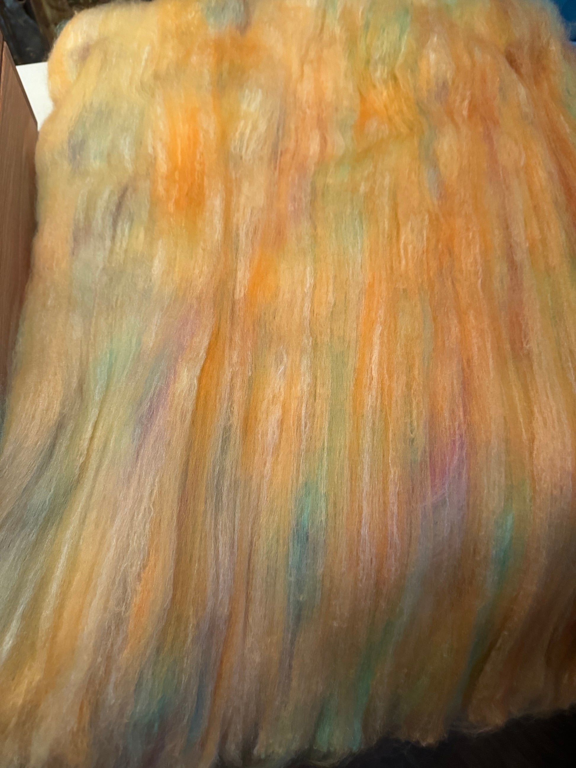 Mixed wool blend; All of my Mega Bish Batts are made with various fibers that I sell in my shop and may contain a variety of fiber types for texture such as tussah and mulberry silks, silk noils, locks, tencel, nylon, some items may contain super wash, bamboos, sari silks etc.