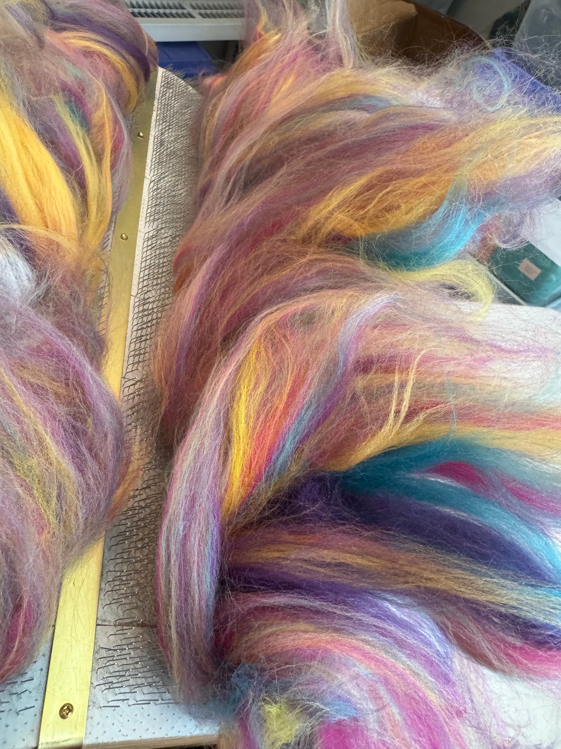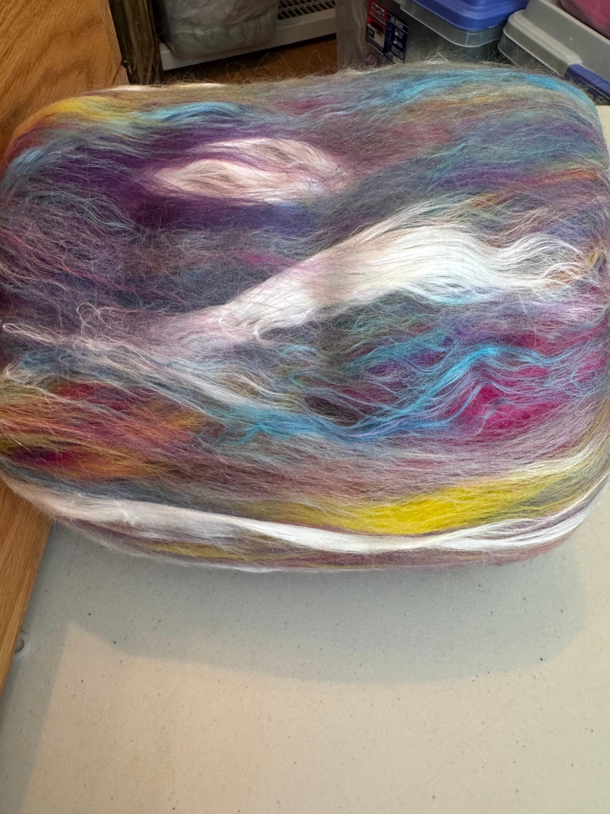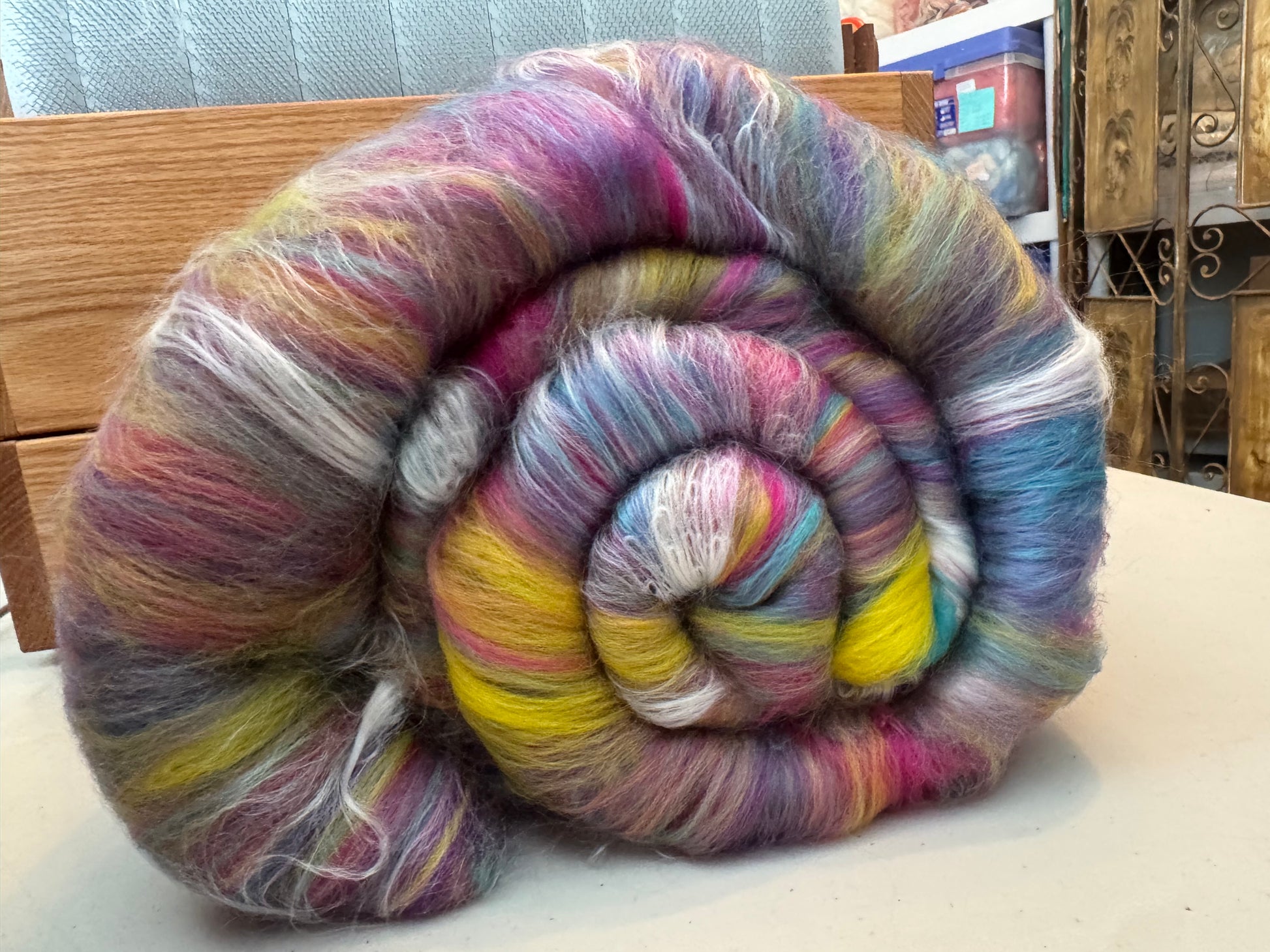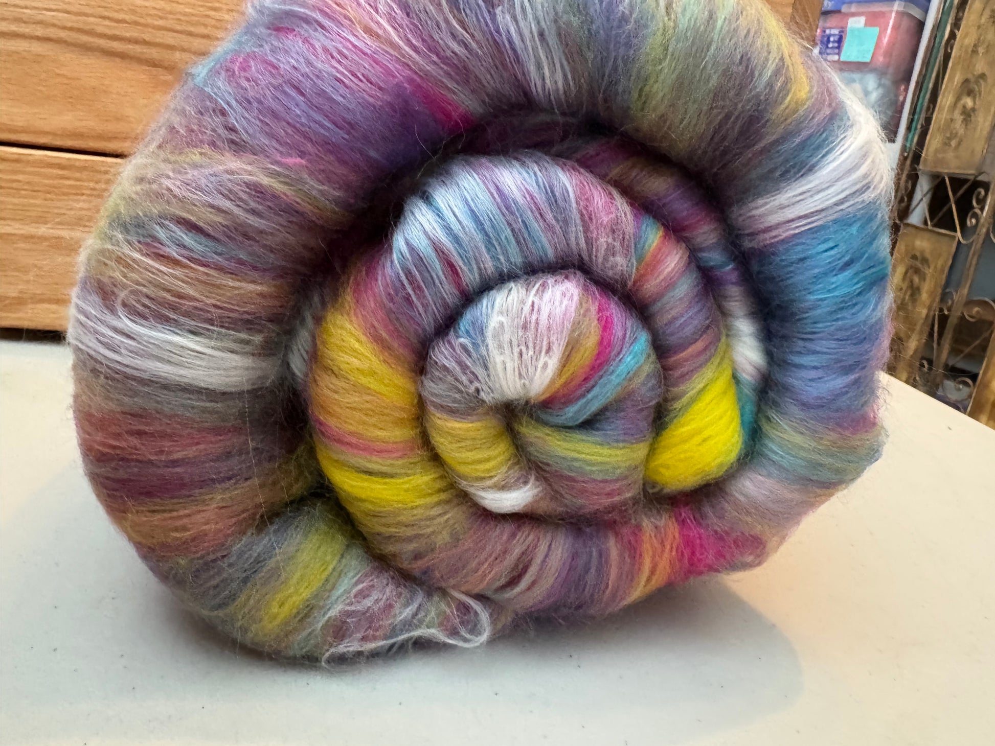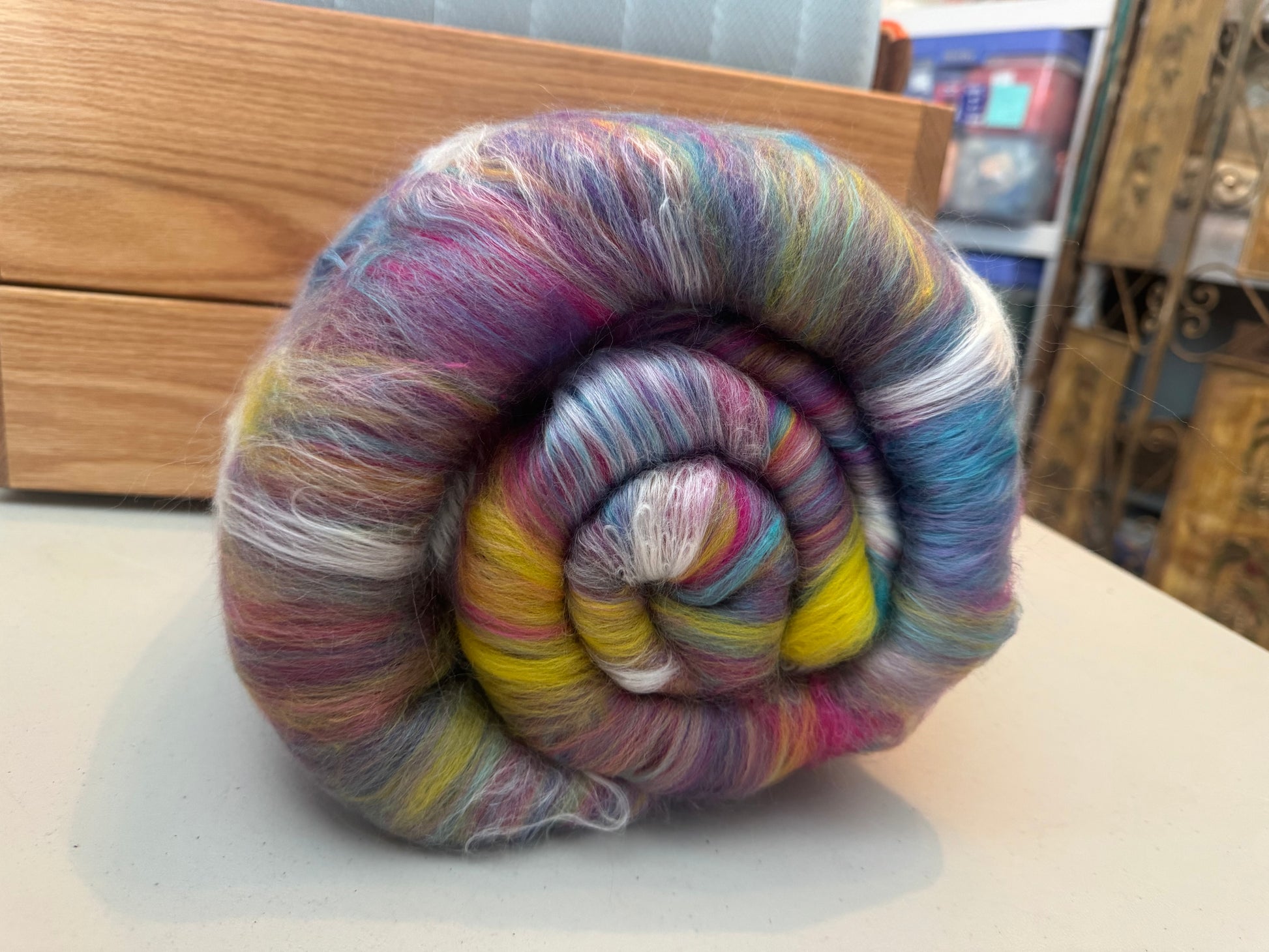 Mixed wool blend; All of my Mega Bish Batts are made with various fibers that I sell in my shop and may contain a variety of fiber types for texture such as tussah and mulberry silks, silk noils, locks, tencel, nylon, some items may contain super wash, bamboos, sari silks etc.