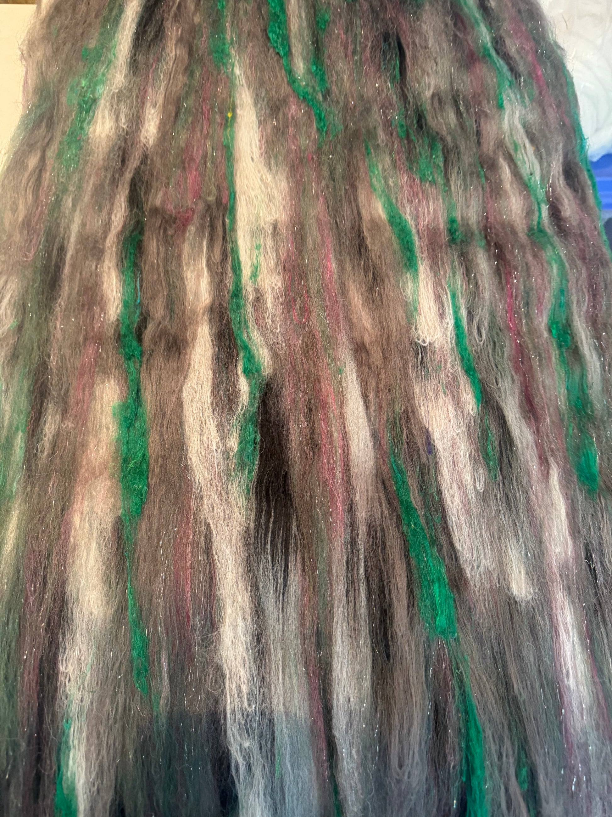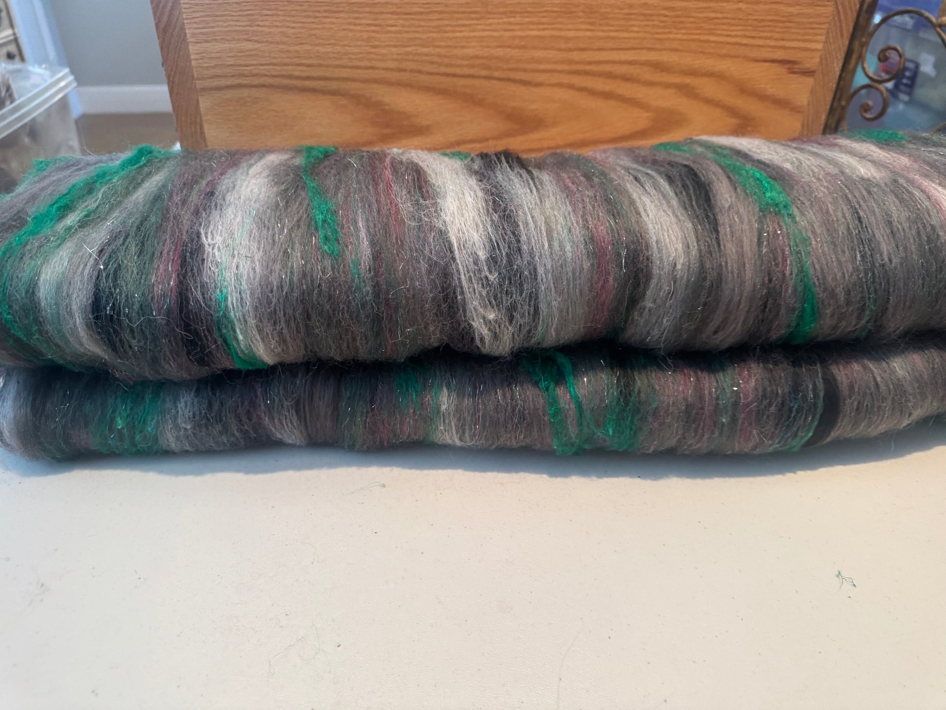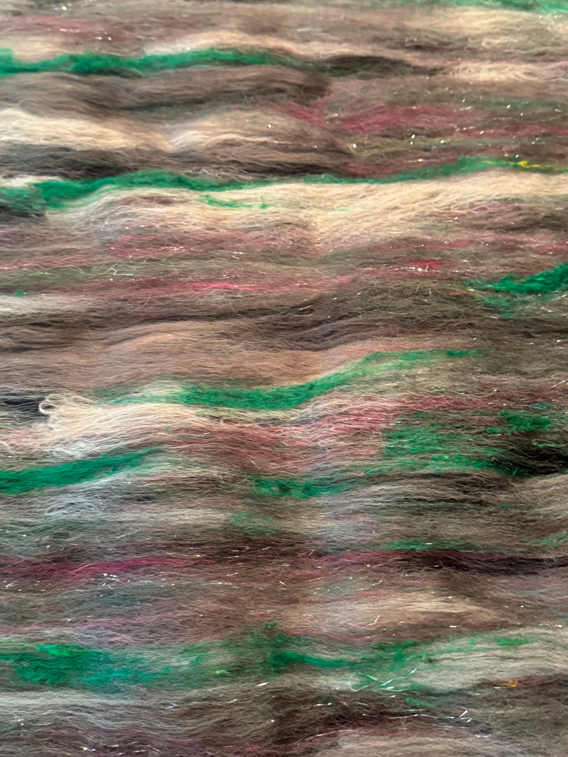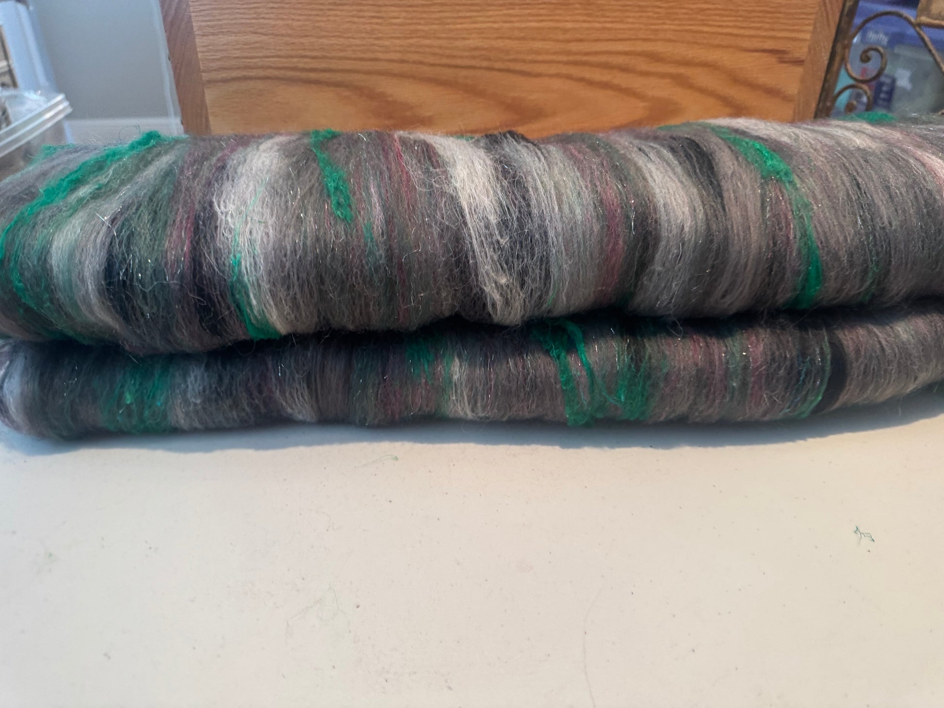 Mixed wool blend; All of my Mega Bish Batts are made with various fibers that I sell in my shop and may contain a variety of fiber types for texture such as tussah and mulberry silks, silk noils, locks, tencel, nylon, some items may contain super wash, bamboos, sari silks etc.