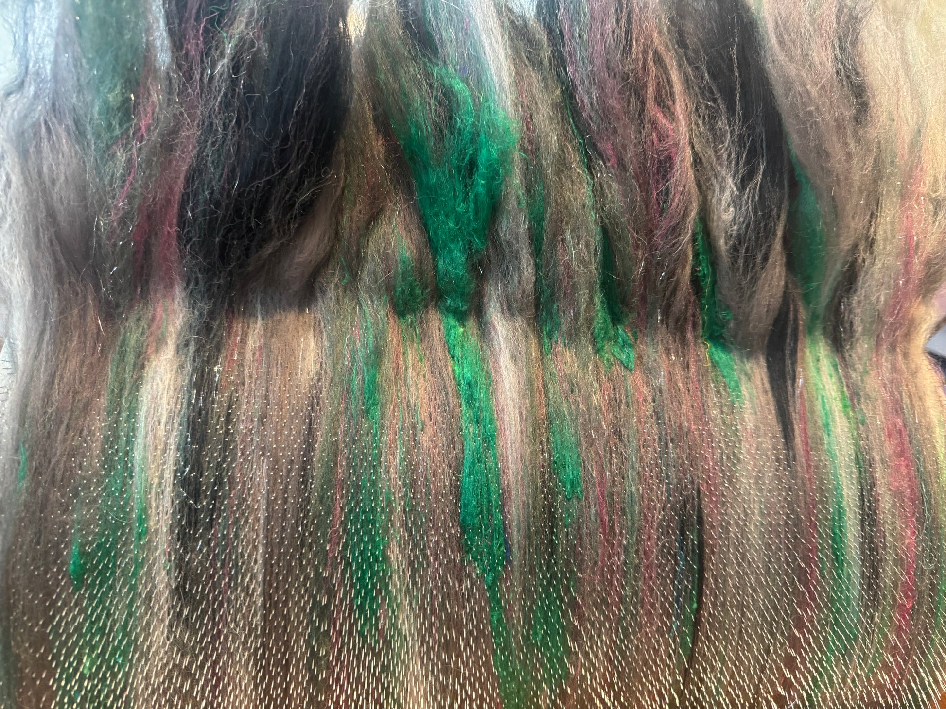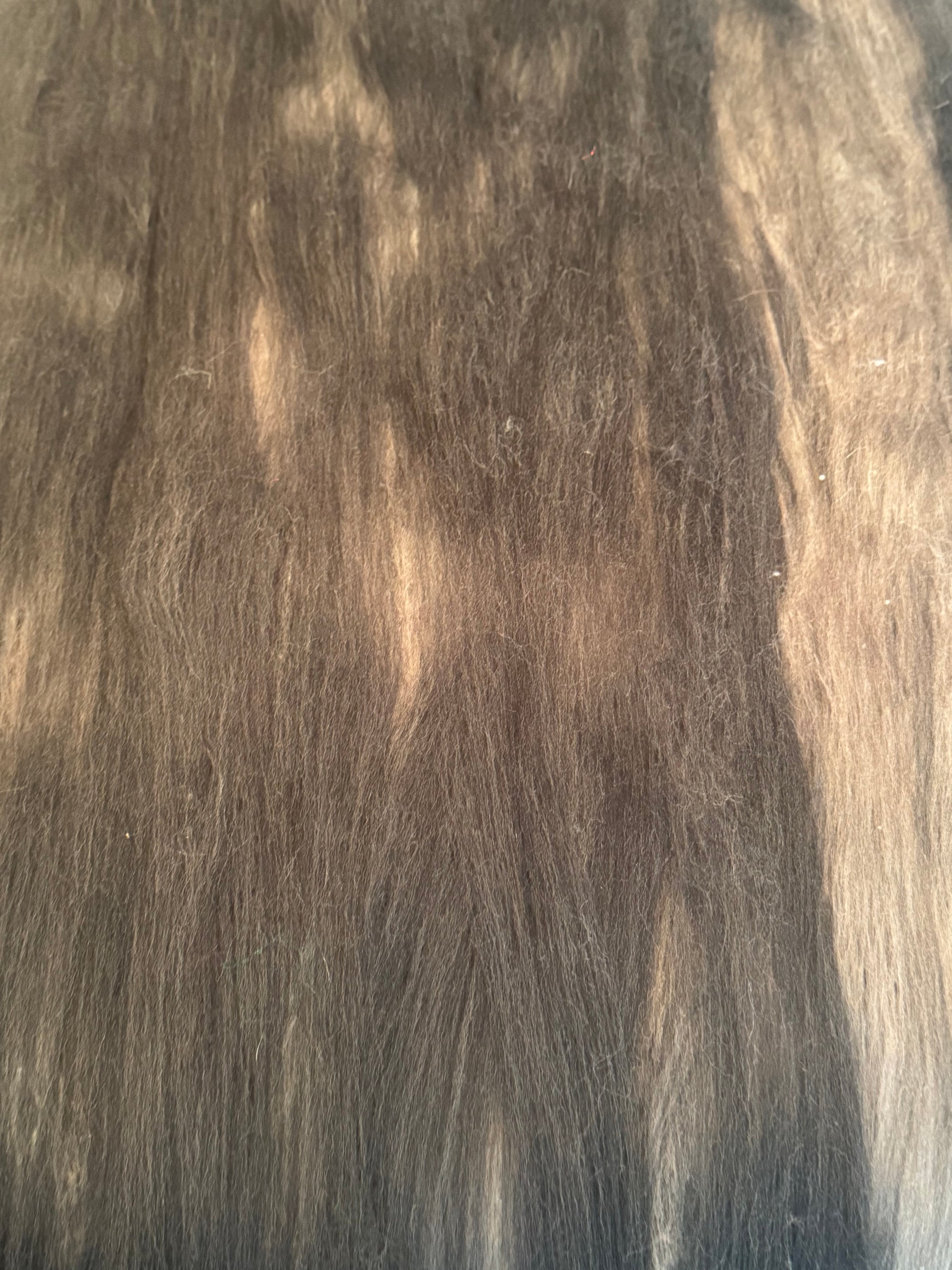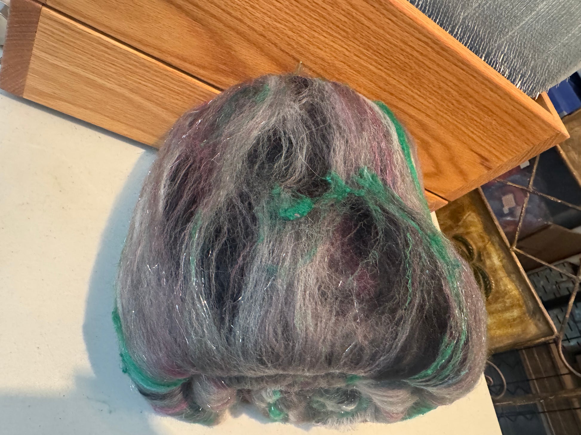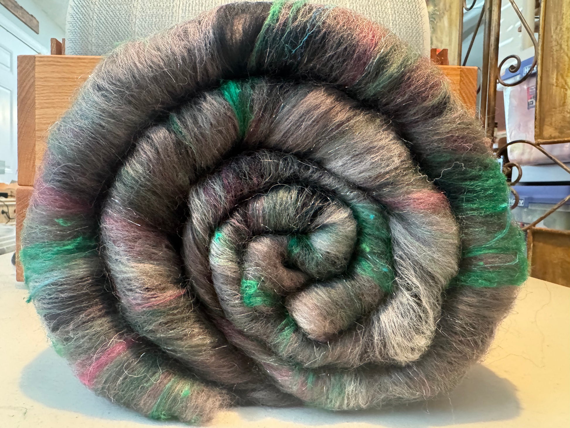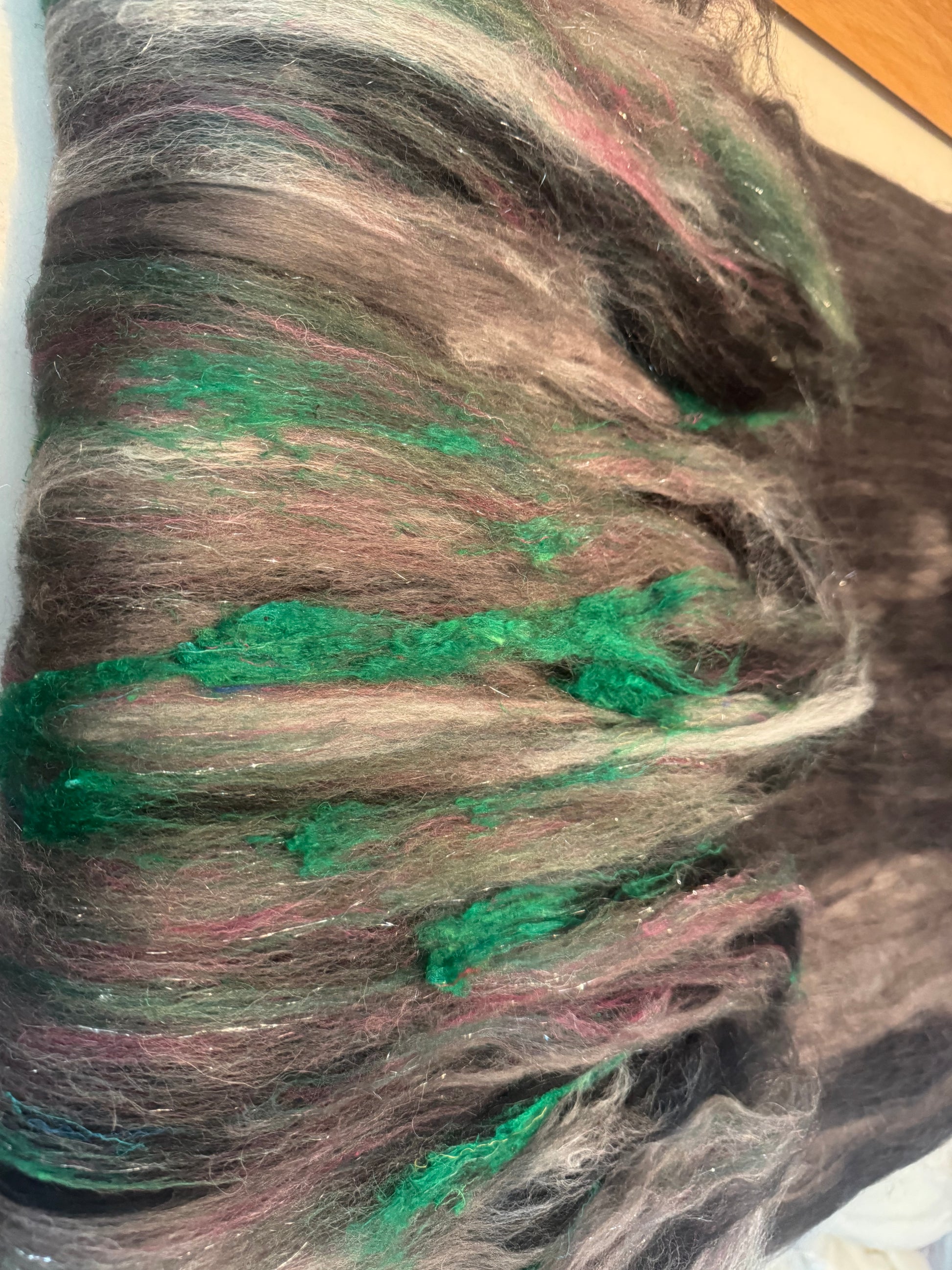 Mixed wool blend; All of my Mega Bish Batts are made with various fibers that I sell in my shop and may contain a variety of fiber types for texture such as tussah and mulberry silks, silk noils, locks, tencel, nylon, some items may contain super wash, bamboos, sari silks etc.