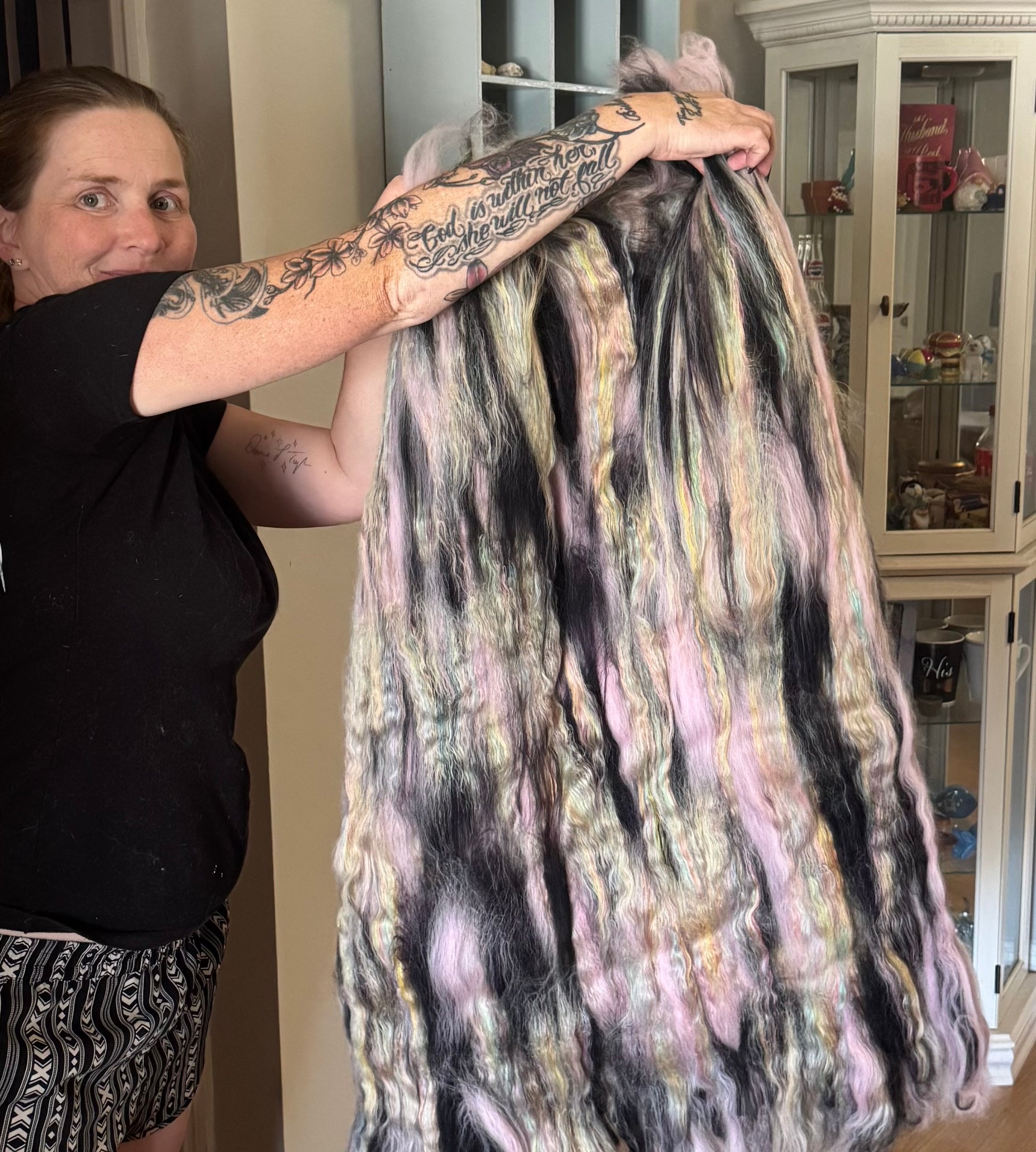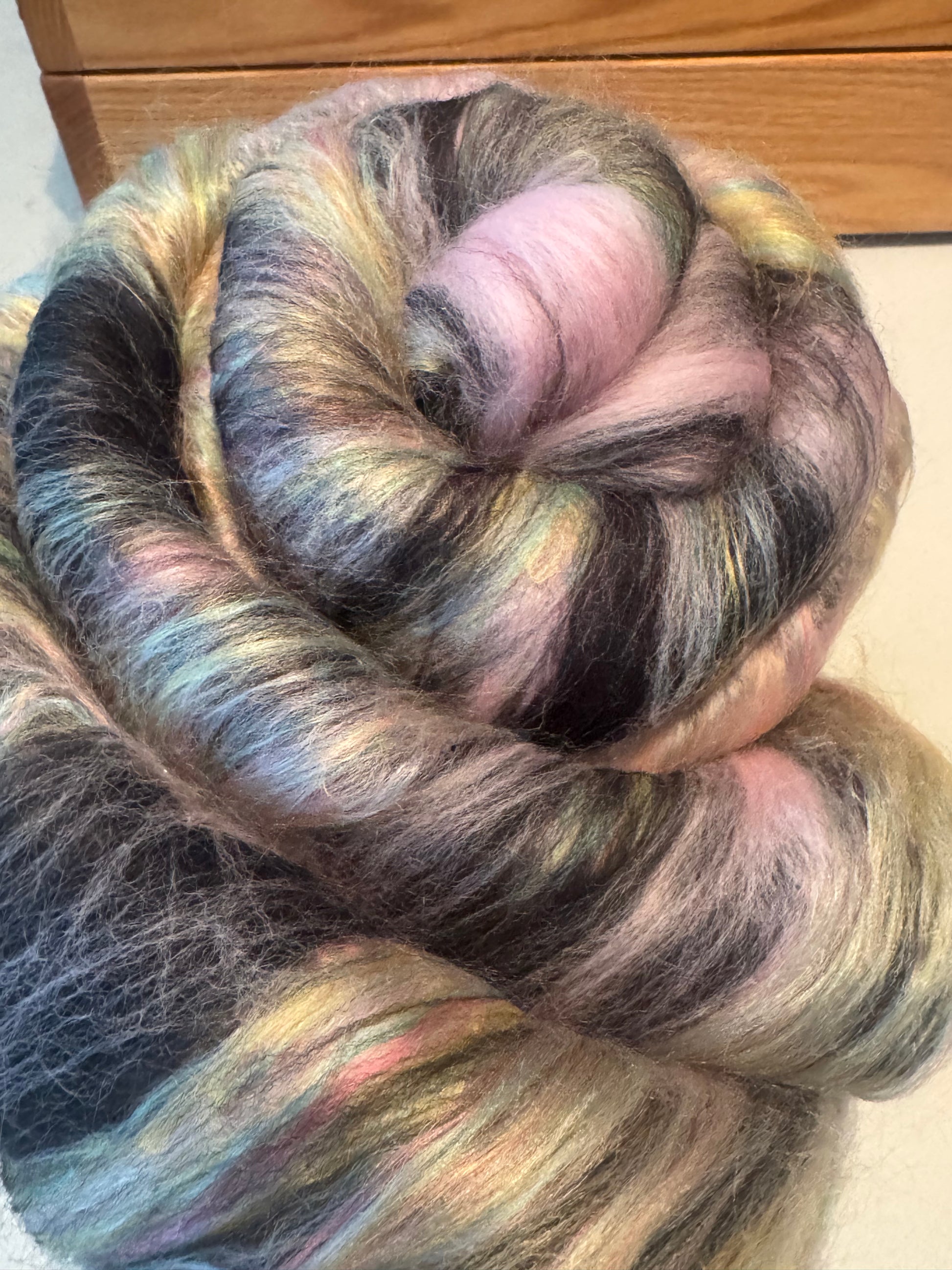This one contains: Light Pink & Black 23 Micron Merino & Multi colored Silks, & Bamboo