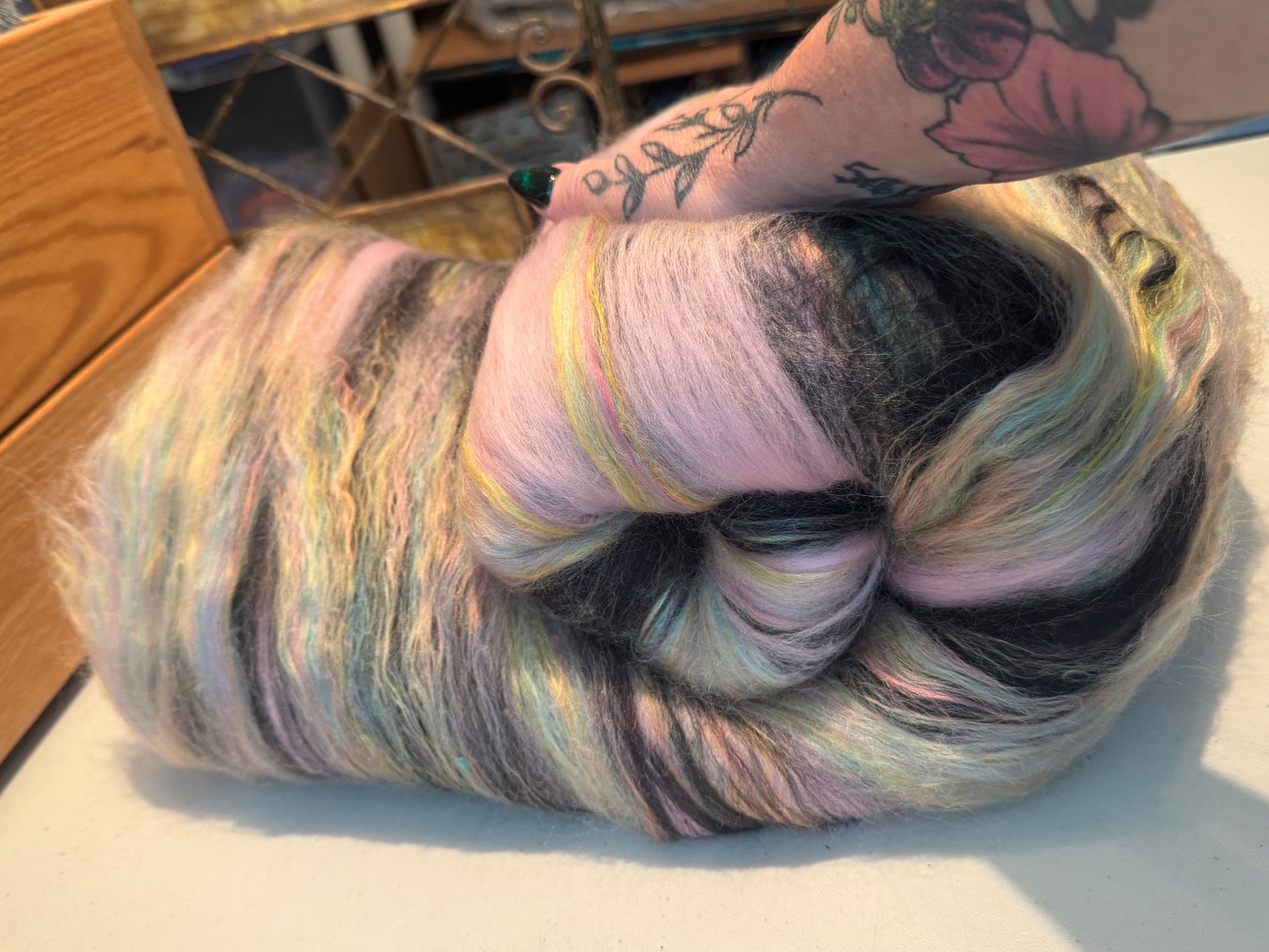 Mixed wool blend; All of my Mega Bish Batts are made with various fibers that I sell in my shop and may contain a variety of fiber types for texture such as tussah and mulberry silks, silk noils, locks, tencel, nylon, some items may contain super wash, bamboos, sari silks etc.
