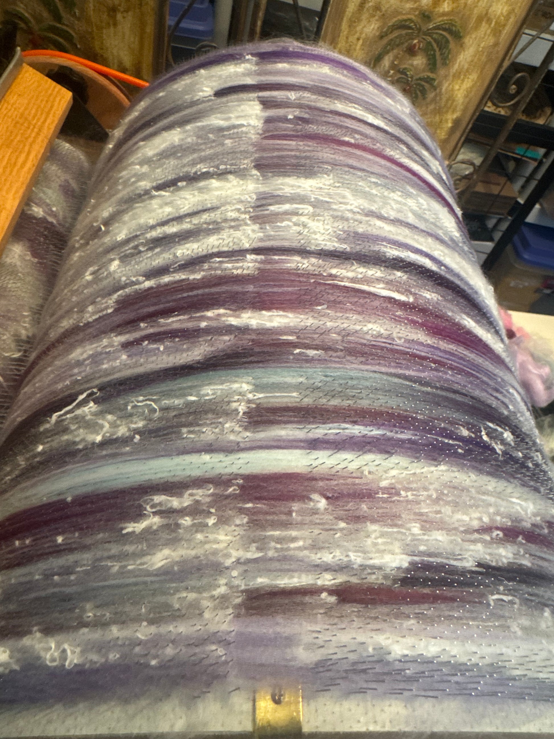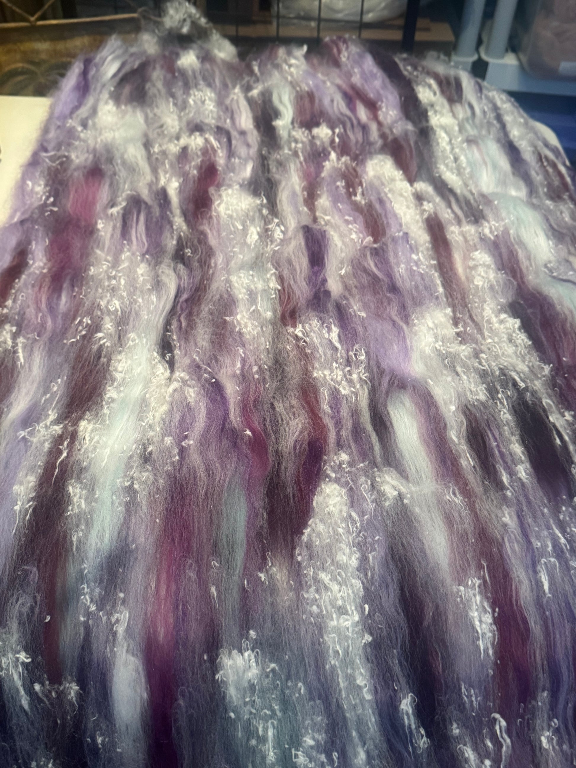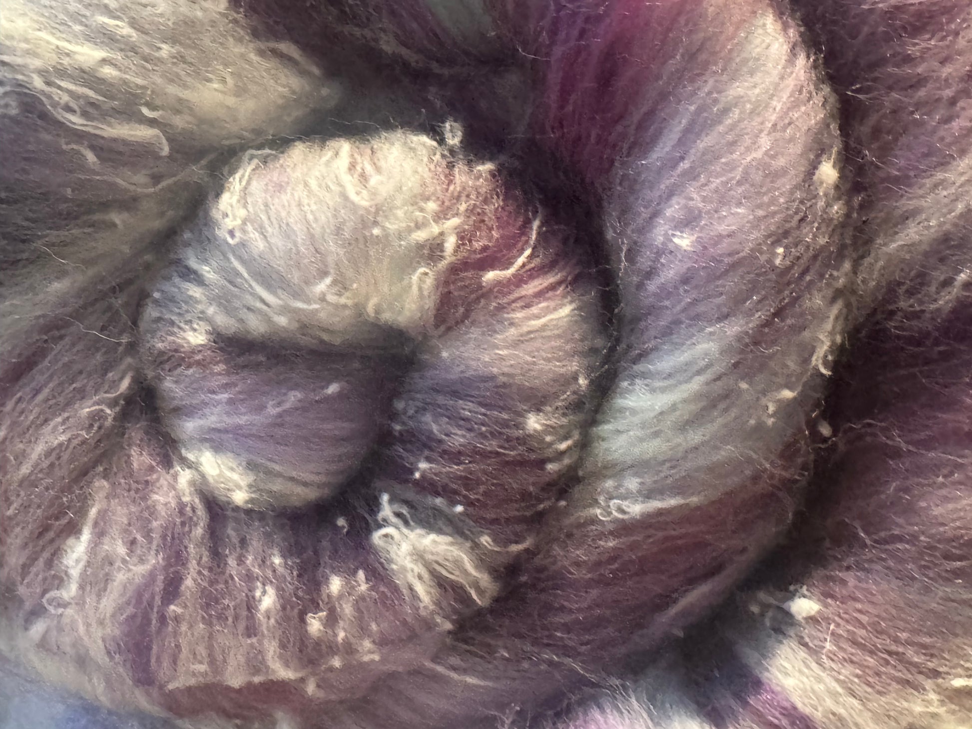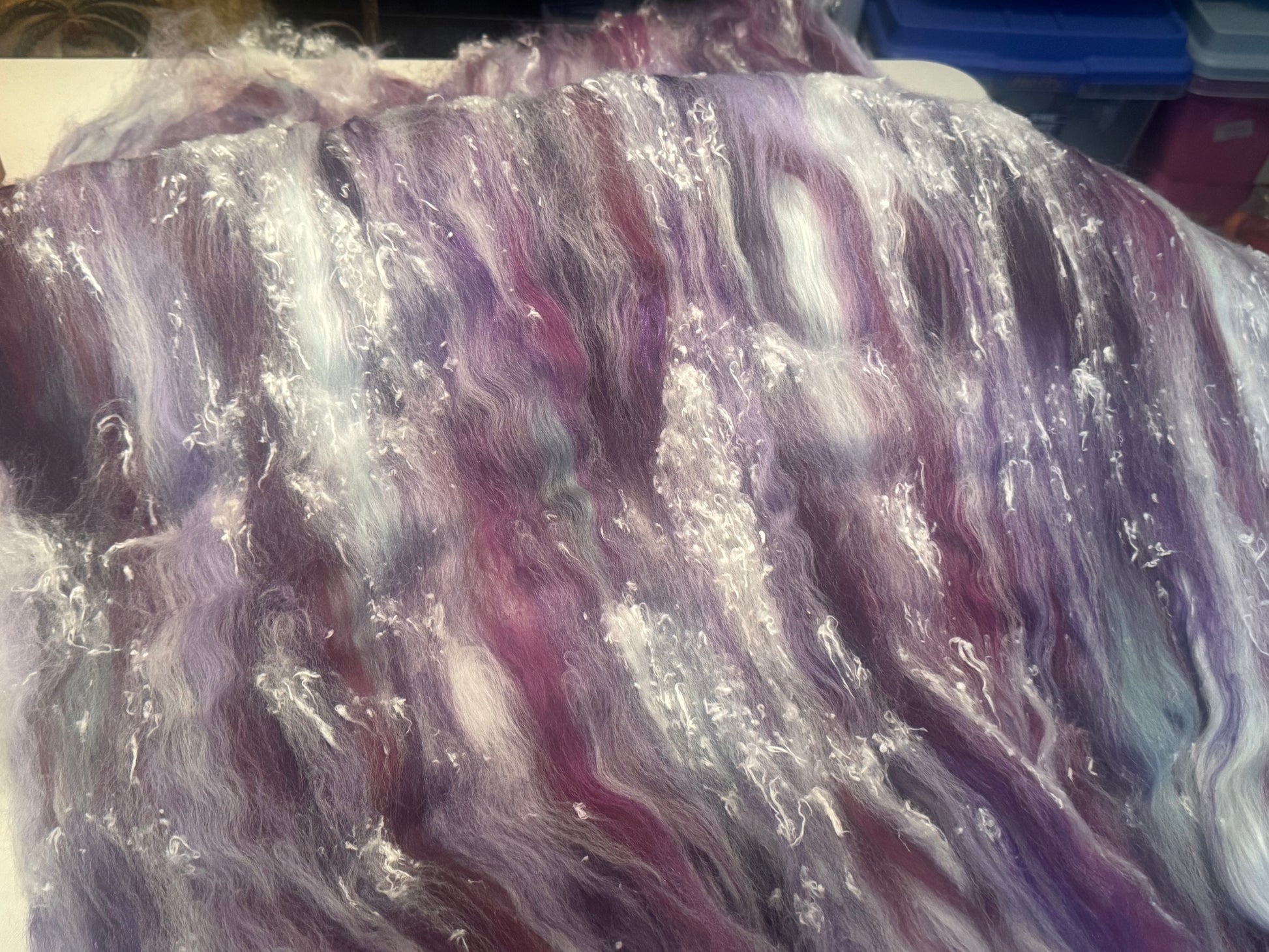 This batt contains various mixed wools, mulberry & tussah silks, silk slubs for textur