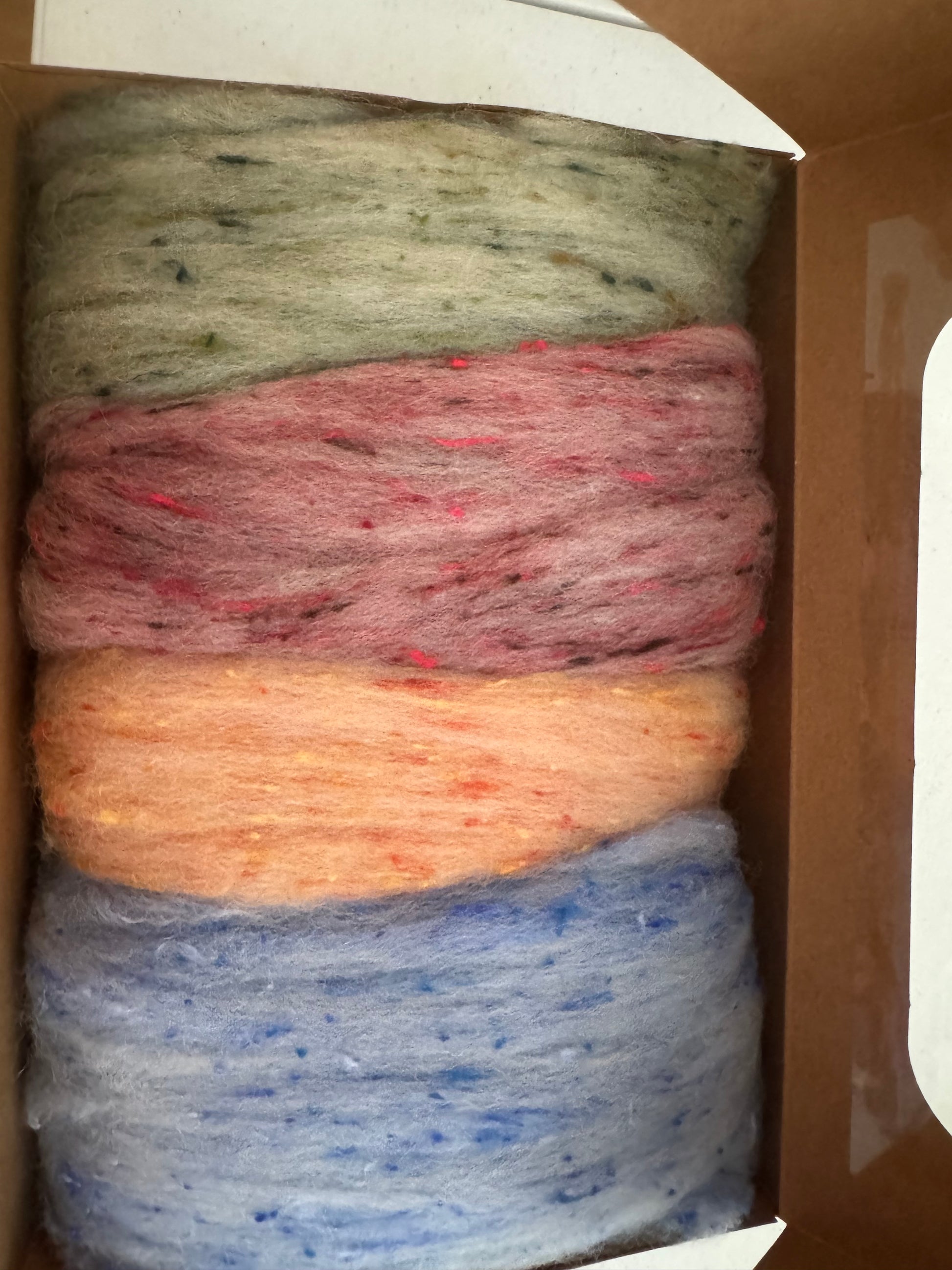 This little snack box includes 4 different tweed colors in 1 oz Sections~Blue, Red, Green, & Orange~ If you want more of a certain color look on my site I offer each color in a 4 oz section on other listings.